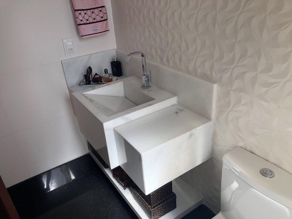 Banho Suite: Piso e Rodapés em Granito Preto São Gabriel, Bancada com Cuba Esculpida, Prateleira e Nicho em mármore Branco Clássico